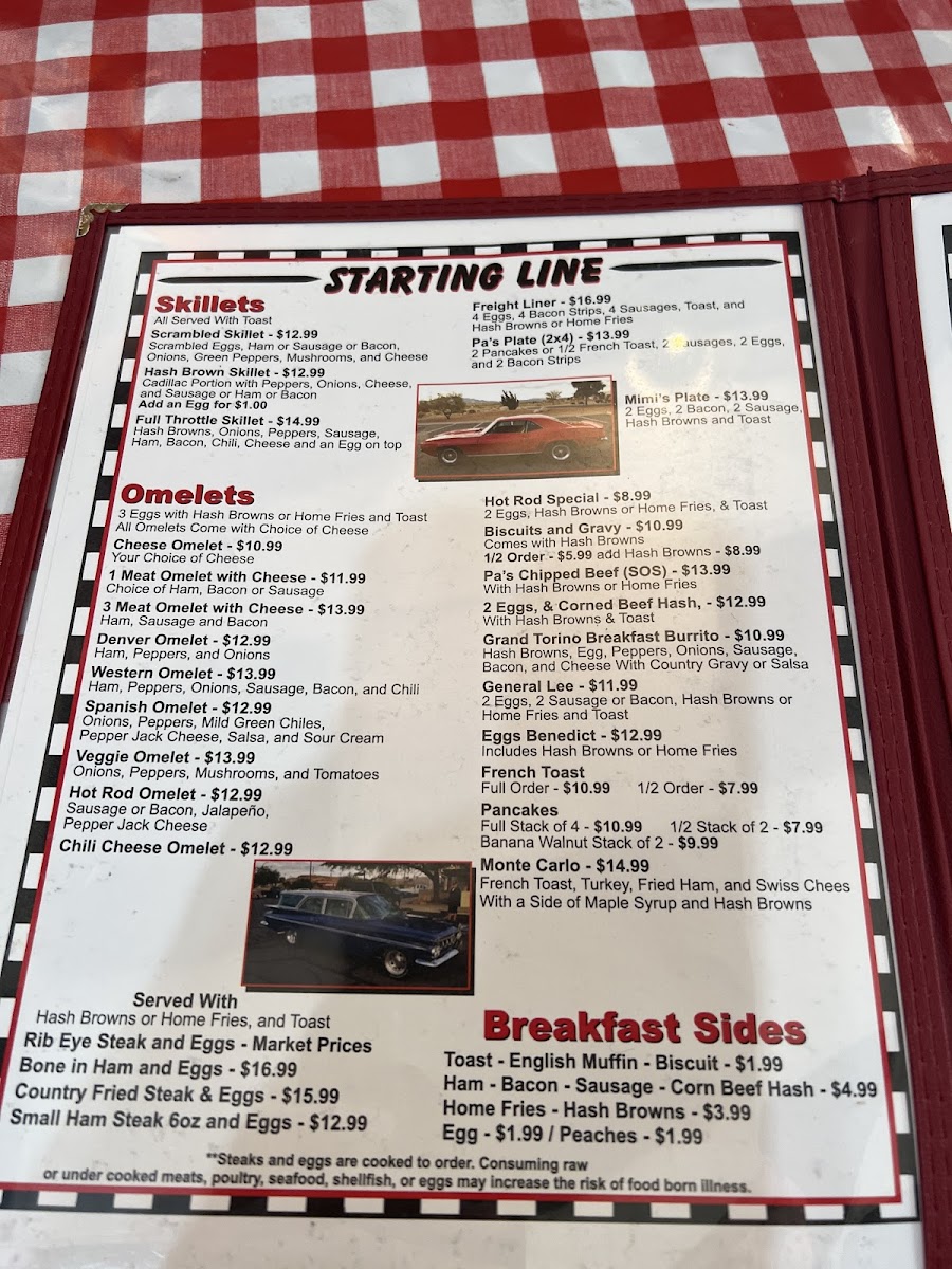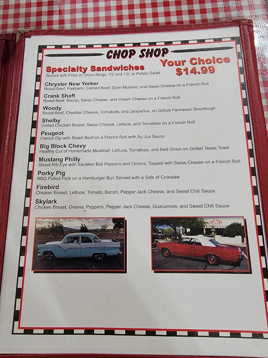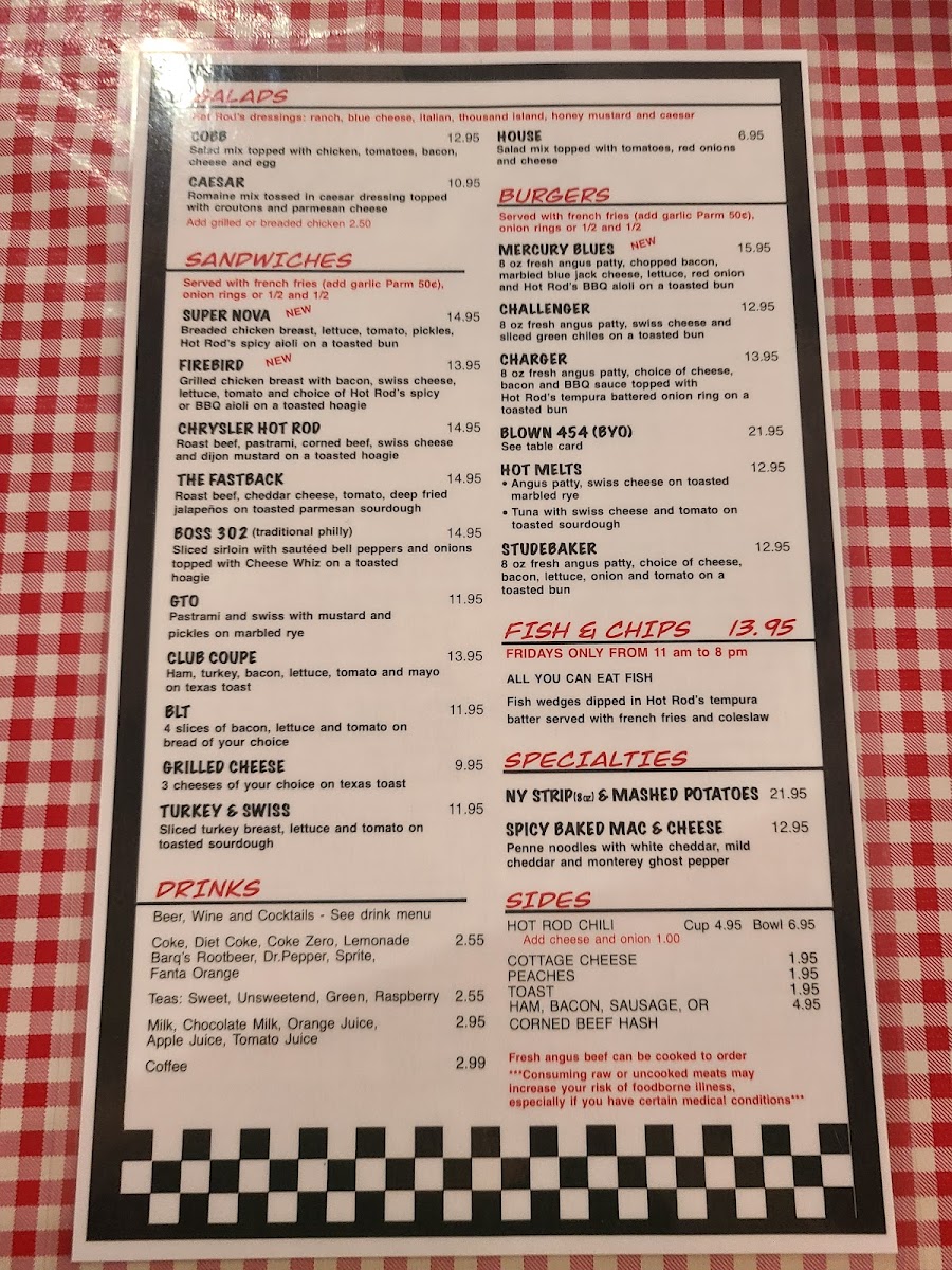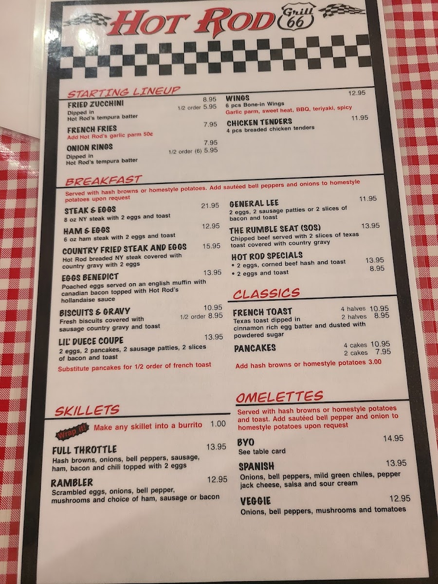 The menu at Hot Rod Cafe offers a variety of American-style dishes suited for breakfast, lunch, and casual dining throughout the day. It features a range of traditional diner options, including hearty breakfast plates, sandwiches, burgers, and specialty hot dogs.