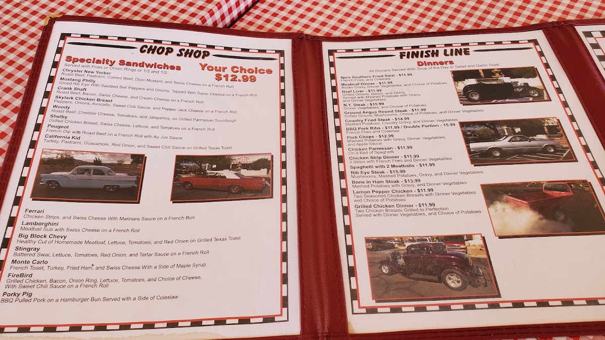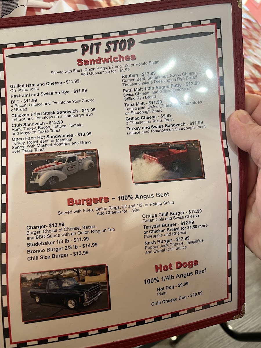 - Pit Stop - Burgers: A variety of burgers are available ranging from 1/3 lb to 1 lb selections, with choices of cheese, bacon, and distinctive toppings like green chili, pineapple, jalapeños, and barbecue sauce. Some examples include the Charger Burger, Bronco Burger, and Ortega Chili Burger.