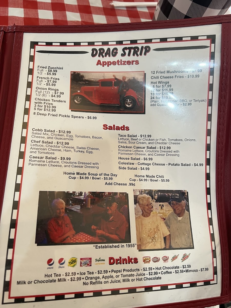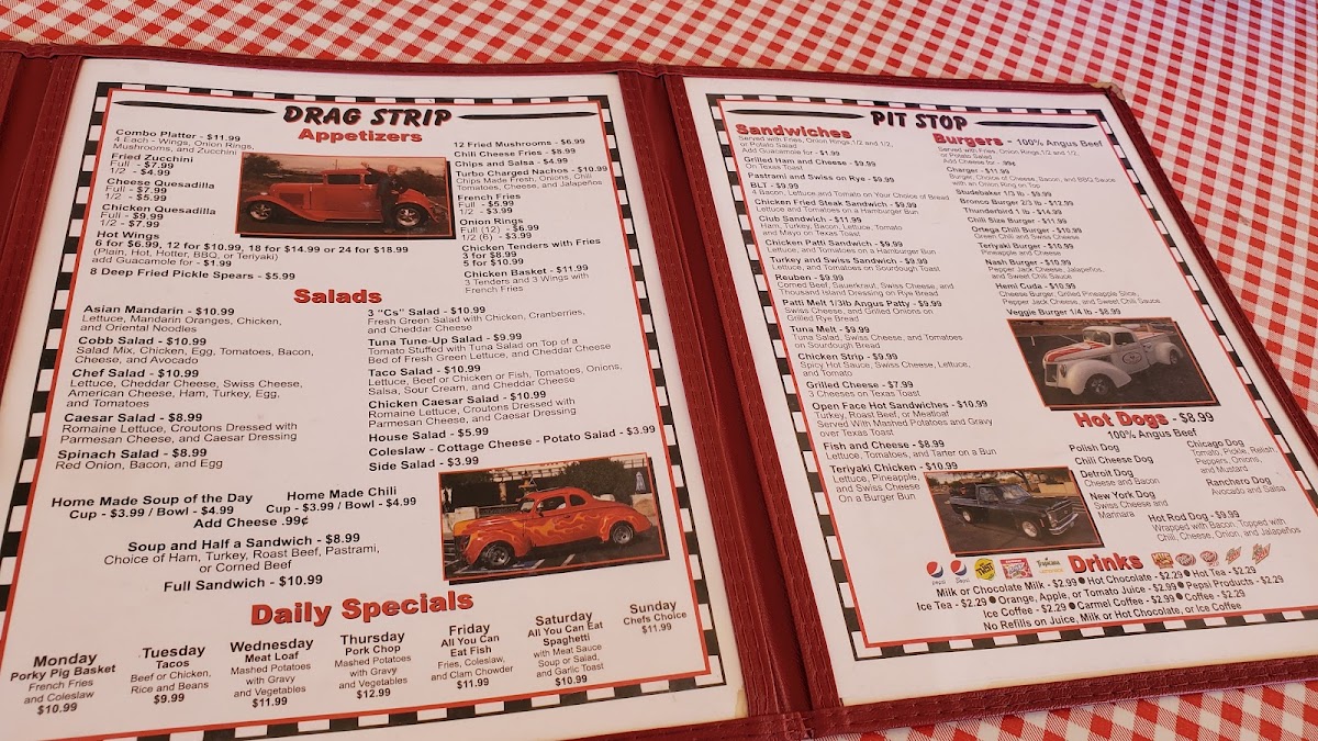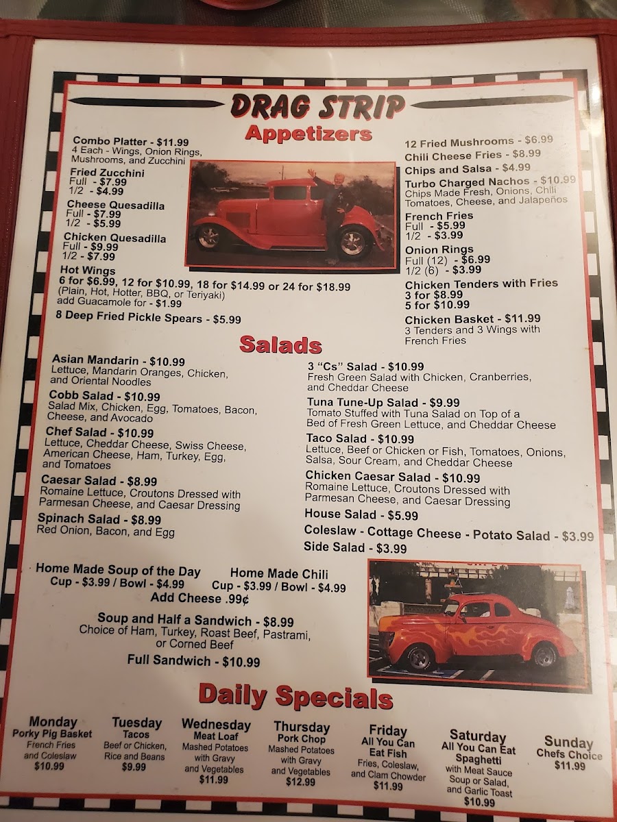 - Drag Strip - Daily Specials: This section includes daily changing specials, such as meatloaf served with mashed potatoes and vegetables, providing a home-style meal option.